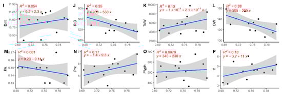 Scatter plot and linear regression for the NDRE and the product characterisation variables for the PT cultivar (A–H) and the SC cultivar (I–P). The blue line represents the regression line; the grey area represents the confidence band (95% confidence interval).