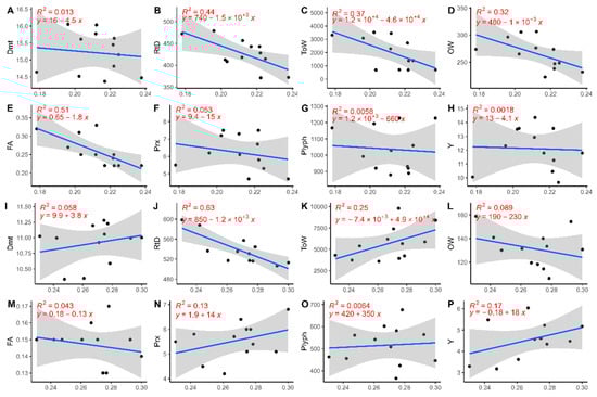 Scatter plot and linear regression for the NDVI and the product characterisation variables for the PT cultivar (A–H) and the SC cultivar (I–P). The blue line represents the regression line; the grey area represents the confidence band (95% confidence interval).