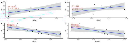 Linear regression and relationship for the two VIs and the MI values for the PT cultivar (A,B) and the SC cultivar (C,D). The blue line represents the regression line, and the grey area represents the confidence band (95% confidence interval).