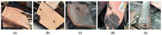 The wheel tread defect types. (a) Light scrap steel; (b) medium scrap steel; (c) heavy scrap steel; (d) oily scrap steel; and (e) confined scrap steel.