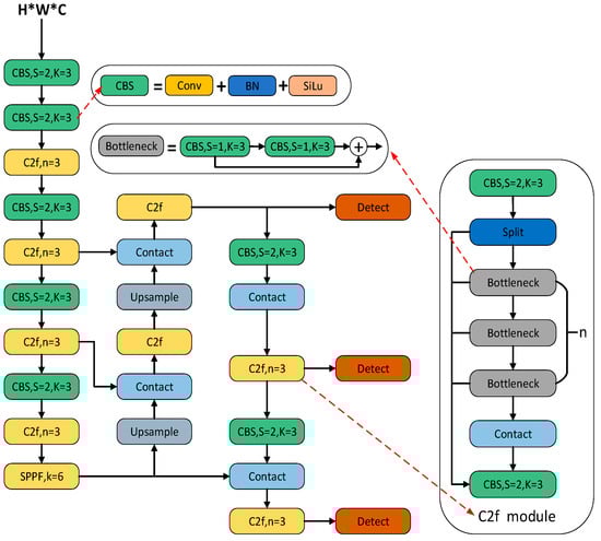 As can be seen in Figure 2, YOLOv8 comprises a feature extraction network and a multiscale feature fusion network. The computational process begins with a feature extraction network to analyze the input image and extract relevant features. Subsequently, target detection is performed with a multiscale feature fusion network, which enables the model to capture information at different scales. Finally, the output consists of four parameters representing the coordinates of the bounding box, as well as the confidence and category probabilities of the predicted frames.