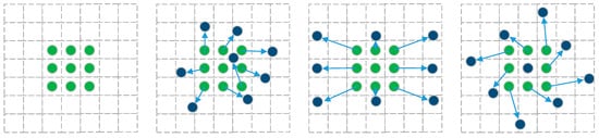 The deformable convolution, on the other hand, calculates the offset of the result through the sampling method of bilinear interpolation to achieve the effect of deforming the convolution kernel. denotes the offset of as Equation (3).