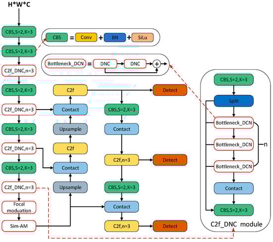 Based on the above analysis, the backbone network of the traditional YOLOv8 algorithm is improved to cope with complex scrap classification scenarios, and the structure is shown in Figure 5 with the red part being the improved part.