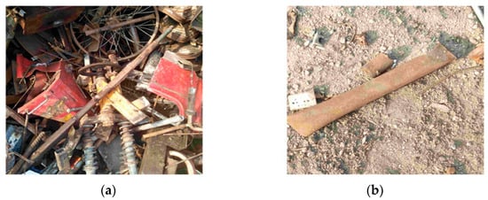 Considering the practical application scenarios of steel scrap classification, the data used in this study were obtained from the Ling-yuan Iron and Steel Group, with a total of 16,071 photos and 3 video recordings of real-time scrap steel unloading in industrial scenarios, where scrap is classified into five types, including light scrap, medium scrap, heavy scrap, oily, and confined. In order to complete the training and validation of the YOLOv8 model, 20% of the datasets from all datasets are randomly generated as the test dataset as shown in Figure 6, where Figure 6a is a multi-target data sample and Figure 6b is a single-target data sample.