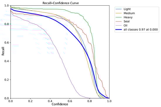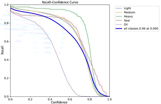 The comparisons of the recall curves of the classical YOLOv8 network model and the improved YOLOv8 network model on the five types of waste categories are shown in Figure 15 and Figure 16. The recall of the improved YOLOv8 model is improved by 1% compared to the classical model. Based on the above results, the improved YOLOv8 network model, also for light scrap, medium scrap, and closed object scrap, has a more significant increase in the recall rate and a smoother curve. It is further demonstrated that the improved model greatly reduces the miss detection probability of the model for similar targets of different shapes and sizes. However, it is worth noting that due to the small number of samples of oil scrap during training and the interference of extremely similar data samples such as rust and shadows, the recall of oil scrap is still the lowest among the five types, although Sim-AM has slightly improved the recall of the oil-type scrap.