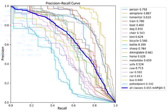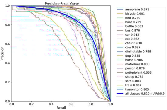 In order to further validate the stability of the improved model proposed in this work, a comparative analysis of the performance of YOLOv8 and the improved YOLOv8 model on the publicly available PASCAL VOC dataset was performed; precision–recall performance curves are shown in Figure 17 and Figure 18.