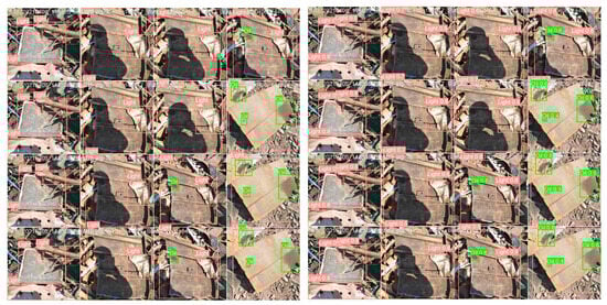The data preprocessing part of the training mainly used hybrid enhancement technology, mosaic enhancement technology, spatial perturbation technology, color perturbation technology, and other methods for training data preprocessing. After preprocessing, not only can the training dataset be effectively expanded and the diversity of data increased but also the overfitting problem of the model can be reduced and the generalization ability of the model improved; the preprocessed data samples are shown in Figure 7.