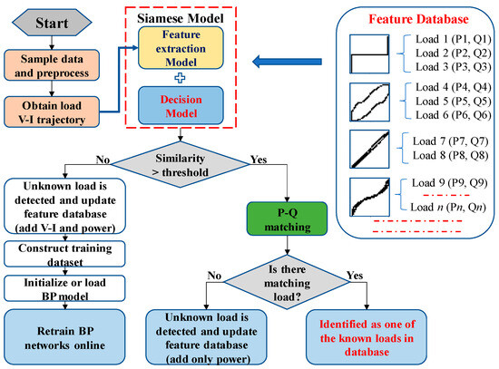 The remainder of this paper is organized as follows: Section 2 introduces the principle of the proposed load identification method based on the retrainable Siamese network. The following section demonstrates the Siamese network structure and training process. And then, Section 4 aims to validate the performance of the proposed method through public datasets and to compare it with other methods. Moreover, this section proves the feasibility of the online training of the BP networks through experimental results. Finally, Section 5 concludes the methodology’s strengths and indicates its limitations.