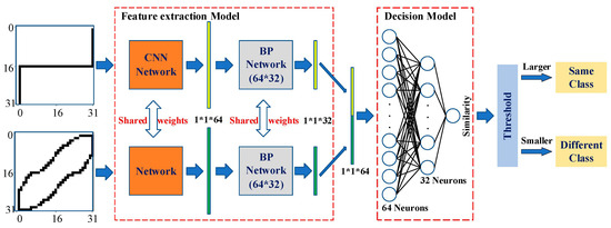 In this paper, the Siamese network is divided into the feature extraction model and the decision model, to achieve the automatic update in real-time, as shown in Figure 3. The feature extraction model consists of a fixed CNN network and a retrainable BP network. The decision model only includes a single retrainable BP network that focuses on calculating the similarity between the feature vectors of the two V-I trajectories.