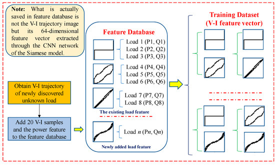 The BP networks will be retrained after an unknown load is found with a different V-I trajectory (for an unknown load found using power feature matching, retraining is not needed). In order to retrain the BP networks, the training dataset involving the V-I trajectory features must be reconstructed. The process of training dataset reconstruction is shown in Figure 5. It should be noted that, in the feature database, it is not the V-I trajectory image itself, but the 64-dimensional feature vector extracted from the V-I trajectory through the CNN network that is saved. Thus, as described in Section 3.2, the time required for identification can be greatly reduced.