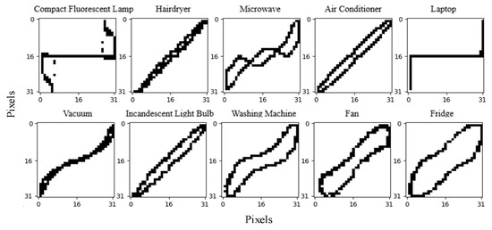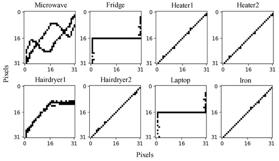 The algorithm to obtain the V-I trajectory image is referred to in [3]. First, the steady-state voltage and current waveforms from appliances that are operating continuously are collected. The voltage and current values are then normalized by dividing their respective maximum absolute values. Next, we segment the plane defined by voltage and current into a 2N × 2N grid of cells and interpolate the original waveform trajectory to maintain the continuity of the curve after converting it into a binary representation form. Finally, these interpolated points are mapped onto the 2N × 2N matrix grid, which has been initialized to all zeros, and the cell is marked as 1 when the data point that the V-I trajectory is mapped to is within the valid range of the grid, otherwise it will be marked as 0. Thus, the image size is the key point in this scenario and the resolution of the V-I trajectory image is set as 32 × 32 in this paper, because the shape features of the V-I trajectory will not be distinctive enough if the pixel number is too small, as it is easy to cause the loss of the high sampling rate data information [24]. On the contrary, if the pixel number is too large, the noise and disturbance in the images will become sharp and will deteriorate subsequent feature extractions [3].
