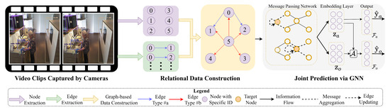 We train the parameters in the network by optimizing the loss function , where refers to the cross-entropy between the predicted results and the ground-truth label. To this end, we develop a GNN-based framework to classify the graph-based content under-recognized nodes and edges and to predict nodes within a given graph. This framework synthesizes human–object interaction to infer activities of daily living.