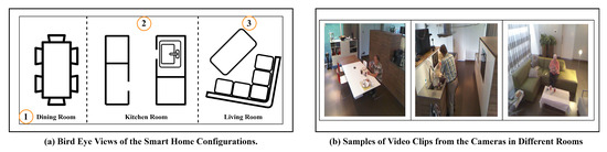 The Toyota Smart Home dataset [17] is a set of video clips collected from different locations of an apartment whose Bird Eye View (BEV) is shown in Figure 2. The reasons for selecting this dataset to evaluate the proposed methods are as follows: (1) It contains over 10,000 video clips captured from different locations in the apartment, providing diversity to record various daily activities. (2) The resolution of video clips captured by cameras is , challenging the identification of human body parts. In this case, understanding between humans and environmental objects provides a promising solution for detecting daily activities.