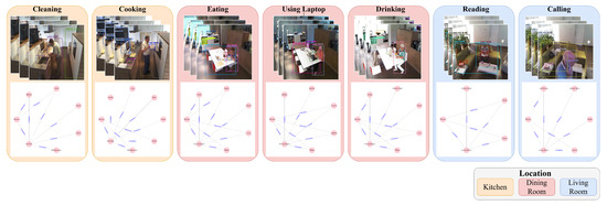 where refer to True Positive, True Negative, False Positive, and False Negative in the Confusion Matrix. refer to the precision, recall and F1-Score at any activities with label k. Table 2 presents the overall results with Equation (14). Compared to the other activities, the proposed method shows poorer performance in identifying cooking and cleaning. This situation could be implied by the presence of common interacting objects in these two activities. For instance, both cooking and cleaning involve bowls and dishes in the same location. Additionally, the location of the camera in the kitchen, as shown in Figure 2, may introduce some uncertainty in efficiently detecting interactions between cookstoves and humans during cooking. This situation could be improved by utilizing image frames from multiple camera views with different locations.
