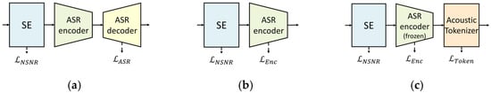 Block diagrams of a pipeline comprising speech enhancement (SE) and automatic speech recognition (ASR) models: (a) a joint training approach using the information on the ASR decoder, (b) a joint training approach using the information on the middle layer (ASR encoder) of the ASR model, and (c) the proposed joint training approach using an acoustic tokenizer.