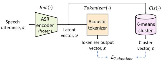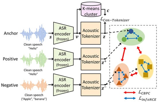 Finally, the contrastive acoustic tokenizer loss function is computed using the tokenizer output vectors of and , as well as the cluster vectors, , with positive/negative pairs in the tokenizer output vector domain, and , of This loss function should be conditioned by and , as shown in the following equation:
