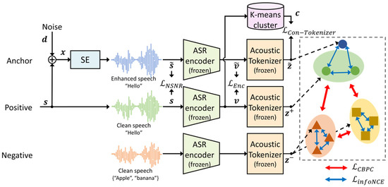 Block diagrams of the proposed joint training approach for the SE model using a negative signal-to-noise ratio (NSNR), an ASR encoder, and the contrastive acoustic tokenizer loss function.