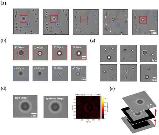 Schematic diagram of the process of creating artificial datasets. (a) Experimental images with different depths. The red and blue boxes indicate the small and large beads, respectively. (b) Feature images at different depths, with the red and blue boxes representing the small and large beads. The focal plane is at 50 μm. (c) Multiple particles with different depths in a synthetic image. (d) Comparison between artificial and original images, showing small differences characterized by randomization. (e) Schematic overview of the image fusion process.