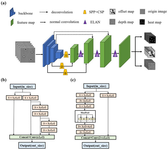 For the Backbone network, we have selected Resnet50, a widely used and well-established choice among backbone networks. The Neck module primarily serves the purpose of information fusion. While a conventional CenterNet network performs only three standard upsampling operations during the Neck phase, our images have distinct characteristics with softly blurred edges in the particle pattern and a subtle difference between the images at varying depths. Softly blurred edges can make localization more difficult. Minor differences between images of different depths can cause the network’s depth prediction difficulties. These characteristics necessitate a better approach to blending our features. Our proposed Neck module draws concepts from the principles of FPN, as illustrated in Figure 3a. The Neck module mainly comprises several ELAN and SPP + CSP modules [16], as shown in Figure 3b,c. Table 1 and Table 2 show the relevant parameter settings in the Neck module. This methodology significantly enhances the informational density of the subsequent features. Moreover, this module can also be integrated into other network architectures, potentially improving their performance in object detection and localization tasks.