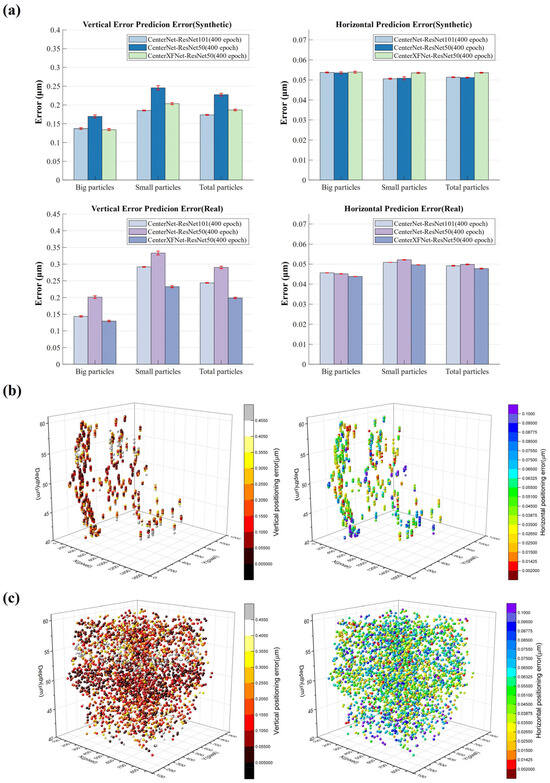 We evaluated the performance of our network using both artificial and real test datasets, and the corresponding results are presented in Figure 5. All three networks can achieve sub-micron-level positioning accuracy, whether on artificial or natural datasets. Specifically, the CenterNet network outperforms the CenterXFNet network on the artificial dataset, with the best horizontal and vertical positioning accuracies recorded at 0.0512 μm and 0.1740 μm, respectively. Meanwhile, the CenterXFNet-ResNet50 network exhibits significantly superior positioning capability on the real dataset compared to the other two networks, with the best horizontal and vertical positioning accuracies measured at 0.0478 μm and 0.1990 μm, respectively (Figure 5a). There are substantial disparities between natural and artificial data, which accounts for the differing positioning performance of the networks across the two datasets. The exceptional performance of the CenterXFNet on the real dataset suggests that, in contrast with the traditional CenterNet network, our proposed network has assimilated more genuinely advantageous features for particle positioning during the training process rather than merely focusing on the ineffectual features present in the artificial dataset.