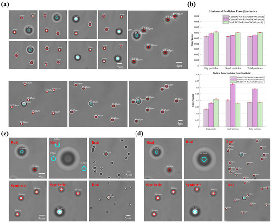 (a) The location result of CenterXFNet-ResNet50. Smaller images are synthetic images, and bigger images are experimental images. (b) Comparative results of CenterXFNet and Mask-RCNN. Localization results on real and synthetic datasets based on (c) Mask-RCNN-ResNet50 (200 epochs) and (d) CenterXFNet-ResNet50 (200 epochs), respectively. (Red circle: Small particle; Blue circle: Big particle).