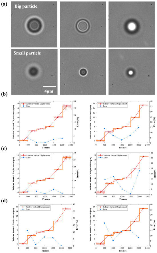 We implemented the trained network for real-time tracking and compared its performance on both large and small particles (Figure 7). To test the tracking system’s performance, the high-density particle mixture solution was allowed to settle within spacers for an adequate amount of time, causing the particles to deposit near the bottom of the cover glass and then stick to the cover glass surface. In this way, it can be considered that the unique displacement of the stage is the same as that of the beads, excluding the influence of the Brownian motion of the bead itself. We subsequently manipulated the electronic stage to different heights at −5 µm, −1 µm, 0 µm, 1 µm, 5 µm, and 10 µm (relative to the focal plane) and conducted real-time tracking to assess the system’s reliability by comparing the tracking results along the z-axis and the movements of the stage.