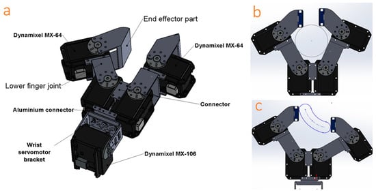 As illustrated in gray in Figure 1a, several 3D-printed PLA and aluminum parts were designed for secure attachment around the two fingers and connections to the actuators. These frames were meticulously designed with precisely sized cavities and channels to accommodate the mounting and wiring of numerous sensors and actuators. The entire modeling and design process of the mechanism and hand module was carried out using the SolidWorks (version 2019) software.