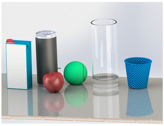 In this study, a selection of everyday objects was chosen from the Yale–CMU–Berkeley (YCB) object set, a collection designed to benchmark robotic manipulation capabilities. These objects were carefully chosen to encompass a diverse range of sizes, shapes, and stiffness levels. The target objects for the gripping operations include a sponge ball, an empty soda can, an apple, a glass cup, a plastic cup, and a small milk packet. Visual representations of these objects can be found in Figure 2.