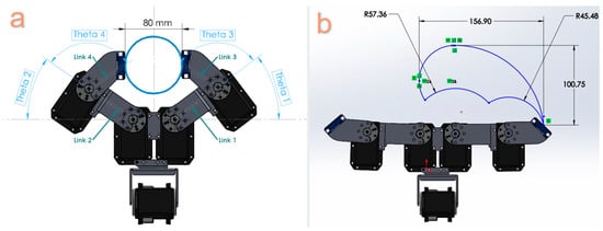 Upon measurement, it was ascertained that all objects had effective diameters falling within the 5-to-7 cm range. Therefore, the initial critical consideration in the design process is to ensure that the robot’s gripper jaws can accommodate these six objects effectively. In simpler terms, the length of the fabricated links (l) and the motor rotation range (θ) must allow the robot to grasp these objects. The findings of the preliminary experiments are presented in Table 1, which outlines the final link lengths and the range of rotation for the servomotors. These specifications resulted in an aperture that can expand to a maximum width of 8 cm, as demonstrated in Figure 3a.