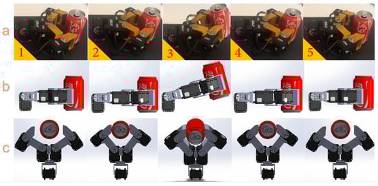 (a) A 3D model of the hand design featuring servomotors for actuation, highlighting the end-effector position and incorporating a combination of aluminum and 3D-printed parts. The diverse range of hand configurations enabled it to grip both (b) symmetric and (c) asymmetric objects.