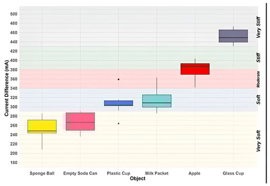 To evaluate the robustness of our control techniques in object classification, we conducted ten comprehensive grasping experiments for each of the six objects. During these experiments, we recorded current values for the touching and grasping operations at the end of the close and load phases, respectively. The difference between these current values was employed to categorize the objects according to the criteria outlined in Table 4. The outcomes of these experiments are illustrated in Figure 6 and Table 5. Figure 6 presents box plots for each object, depicting the distribution of current difference values recorded during the ten experiments and illustrating how each object aligns with various stiffness classes based on current differences. Complementing this visual representation, Table 5 summarizes the number of experiments out of ten, where each object has been categorized into different stiffness classes.