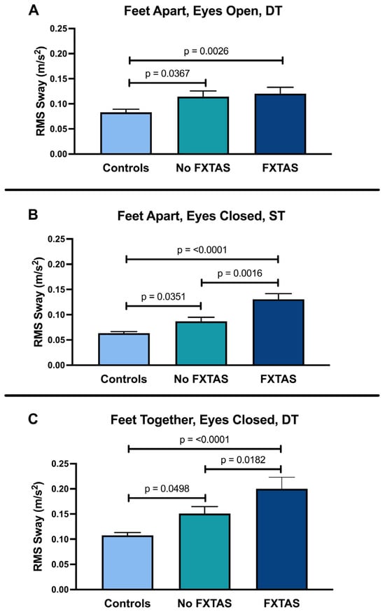 Postural sway outcomes and the results of the regression analysis are shown in Table 2. The FXTAS group performed significantly worse than both the controls and the no FXTAS group in almost all balance conditions. The no FXTAS group performed similarly to the healthy controls in most of the balance conditions except for three postural sway parameters that were significantly worse than controls. First, when participants were asked to stand on a firm surface with their feet apart (FA) and eyes open (EO) while simultaneously performing the cognitive task (FAEO DT, firm condition), RMS sway was found to be significantly greater in both the no FXTAS group (p = 0.0367) and the FXTAS group (p = 0.0026) compared with the controls (Table 2; Figure 1A). RMS sway was also significantly increased in the no FXTAS group compared with the controls in the (1) firm surface, feet apart, and eyes closed ST condition (FAEC ST, firm; p = 0.0351; Figure 1B) and (2) firm surface, feet together, and eyes closed while simultaneously performing the cognitive dual task (FTEC DT, firm; p = 0.0498; Figure 1C). Thus, a measurable impairment in RMS sway, signifying greater postural sway variability, was found in the no FXTAS group compared with the healthy controls. A statistical trend (p < 0.10) was found for higher RMS sway in the no FXTAS group than controls in the following five additional conditions: (1) FTEO ST, firm (p = 0.0795), (2) FTEC ST, firm (p = 0.0706, (3) FAEC DT, firm (p = 0.076), (4) FTEO DT, firm (p = 0.0682), and (5) FTEO, foam (p = 0.0537). There were two postural sway conditions that revealed significant differences between the controls and FXTAS groups but were not different between the FXTAS and no FXTAS groups (1: TSA and RMS sway in the FAEO DT, firm condition, 2: RMS sway in the FTEO DT, firm condition).