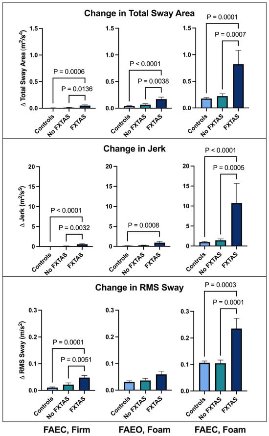 Changes in postural sway scores on the conditions of the mCTSIB relative to baseline are shown in Figure 2. The FXTAS group demonstrated a significantly increased change in TSA, jerk, and RMS sway compared with the controls and PMCs without FXTAS under both eyes closed conditions (FAEC ST, firm and FAEC ST, foam). Under the FAEO ST, foam condition, the FXTAS group exhibited significantly increased TSA compared with the control and no FXTAS groups, and significantly greater jerk than controls. There were no significant differences between the control, no FXTAS, and FXTAS groups in the RMS sway domain under FAEO ST, foam stance.