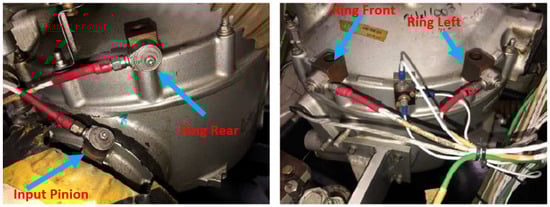 The HTTF is fitted with four single-axis accelerometers as shown in Figure 2. One of the sensors is placed at the input pinion flange (Input Pinion sensor), while the other three are placed on the upper housing flange around the ring gear as follows: Ring Front at the front of the gearbox; Ring Left at the left side of the gearbox; and Ring Rear at the rear of the gearbox. Note that the locations are approximate and relative to viewing forward of the helicopter. A once-per-rev inductive tachometer on the input shaft was used in the synchronous averaging process.