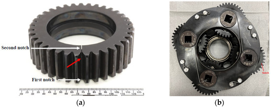 Four-planet setup and the physical location of the gear notches (a) the notched planet gear prior to the second part of the test; (b) bottom view of the planetary assembly.