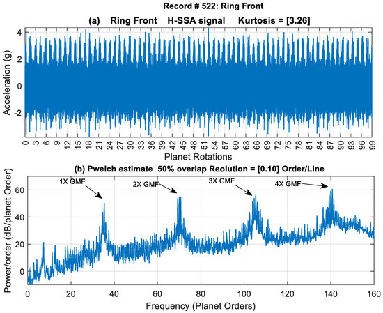 To illustrate the effectiveness of the traditional approach in extracting fault features, record #522 (late stage of crack growth) is examined below. Figure 5 shows the H-SSA signal of the Ring Front sensor along with the power spectral density (first four gear mesh harmonic orders that are integer multiples of 35). The signal is dominated by the gear meshing vibration and shows no obvious signs of impulses (spikes). It has a low kurtosis value of 3.26. Gear mesh harmonics can be seen clearly in the power spectrum surrounded by sidebands. A zoomed-in plot showing sidebands around the 1st and 2nd gear mesh harmonics is presented in Figure 6. It can be seen that the 1st gear mesh frequency (odd harmonic) is suppressed and that sidebands are dominant. The sidebands are spaced at 2× carrier frequency, which is half the planet pass frequency (planet pass frequency = 4× carrier frequency). A detailed explanation of GMF suppression and sidebands presence for this 4-planet gearbox was provided in [28] and compared to the 3-planet configuration. The asymmetry of the modulation sidebands about the GMF in the 4-planet arrangement was discussed based on McFadden and Smith’s model [2]. It was concluded that sideband modulation at the 2× carrier rather than at the 4× carrier happens because the planet gears in this configuration come in pairs spaced at 180° apart, and the angle between each of the planets is not 90° (approximately 88.6° and 91.4° for each pair as presented in Section 2.1.1).
