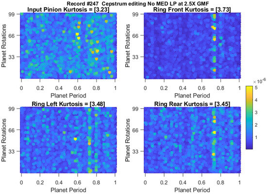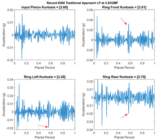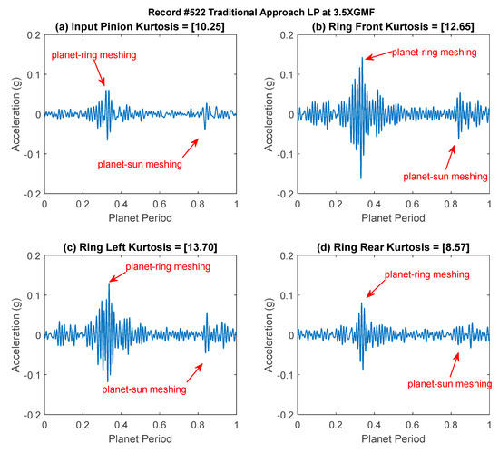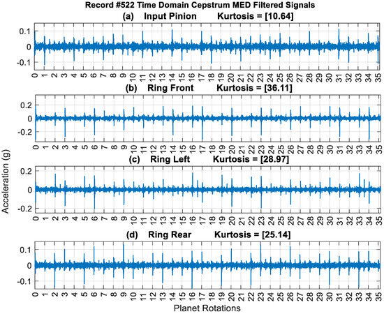 Figure 17 provides a typical result of crack feature extraction and enhancement using the new cepstrum-editing method with and without MED filtering. The result presented is taken from record #522 for the Ring Front sensor and presents 35 planet gear rotations (out of the 99 rotations), i.e., just above 12 carrier rotations. The raw signal Figure 17a has a low kurtosis value of 3.26 and is dominated by gear mesh frequencies. Cepstrum editing increased the kurtosis levels to 6.08, as shown in Figure 17b. The cepstrum-edited signal with low-pass filter at 2.5× GMF is plotted in Figure 17c. Impulses (planet-ring mesh) can now be seen clearly at every revolution of the planet gear, with smaller ones (planet-sun mesh) seen in between. Figure 17d shows the outcome of enhancing the cepstrum-edited low-pass filtered signal using MED, where kurtosis levels increased notably from 22.28 to 36.11 indicating a clearer impulse enhancement and reduced noise level. The use of MED provides a much clearer picture of impacts at every rotation of the planet gear, as can be seen from Figure 17d where high amplitudes are seen at planet rotations 3, 6, 9, 10, 13, 14, 16 and 17. The highest impacts are observed to repeat every 17-planet rotation, as was seen earlier from the cepstrum analysis provided in Figure 9. Note that 17 revolutions of the planet is very close to 6 (i.e., 17 × 35/99 = 6.01) revolutions of the carrier—approximately 1% off being an integer number—so the relative position of the planet and the carrier would almost be the same every 17 planet rotations and thus be reinforced in the averaging process. Results obtained from other sensors are plotted in Figure 18. This shows a clear detection of impulses with higher kurtosis values compared to the synchronous averaged signal results presented in Figure 7.