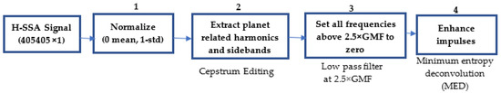 The proposed new signal processing algorithm to extract and enhance rim crack impulses is presented in Figure 8. The algorithm consists of four main steps, with the first and third steps being common to those used in the traditional approach (normalization and low-pass filtration). The second step works on the retrieval of planet-related harmonics and sidebands using a cepstrum-editing technique [23,29,30,31] as explained in Section 2.3.1. This step has two main purposes: the first is to retain synchronous information relevant only to planet gears, and the second is to remove the effects of the transfer path (pre-whitening). The fourth step (Section 2.3.2) employs the MED technique [25,32] to enhance the fault features (impulses).