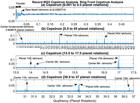 Figure 9 presents the cepstrum domain plot for the Ring Front sensor record #522. This is illustrated using four subplots to highlight families of rahmonics across different quefrency ranges. Interesting observations can be seen here that are not seen in both the time and frequency domains of Figure 5 and Figure 6, respectively. Figure 9a displays the low quefrency region (0.001 to 0.5 planet rotations), where transfer path effects (transient low quefrency part) can be seen clearly in addition to a gear mesh rahmonic at 0.0286 (i.e., 1/35). Figure 9b shows the quefrency range from 0.5 to 45 planet rotations, where two families of rahmonics are evident. The first rahmonic family relates to the planet carrier and occurs at multiples of 2.82857 planet rotations (i.e., 99/35); the second family relates to the planet rotation and occurs at integer multiples of the planet rotation. High amplitudes of the rahmonic family related to the planet gear rotation are seen at exactly 17 and 34 planet rotations, which are very close to adjacent rahmonic components of the planet carrier. This is further shown in Figure 9c,d, which provide zoomed-in views around the 6th rahmonic of the carrier and the 17th rahmonic of the planet, and the 12th rahmonic of the carrier and the 34th rahmonic of the planet, respectively.
