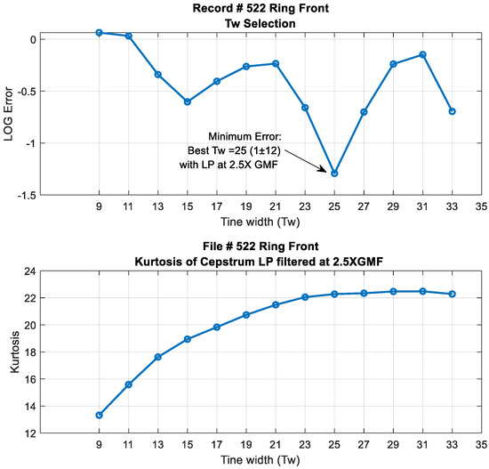 Tine width selection criterion by minimizing the squared error between consecutive low pass cepstrum filtered outputs. Top: Log error vs. Tw. bottom kurtosis values vs. Tw.