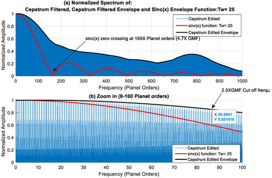 Normalized spectrum of cepstrum filtered signal, cepstrum filtered envelope signal and sinc(x) envelope (absolute value) function: Tw = 25 (a) 0–1000 planet orders (b) 0–100 planet orders.