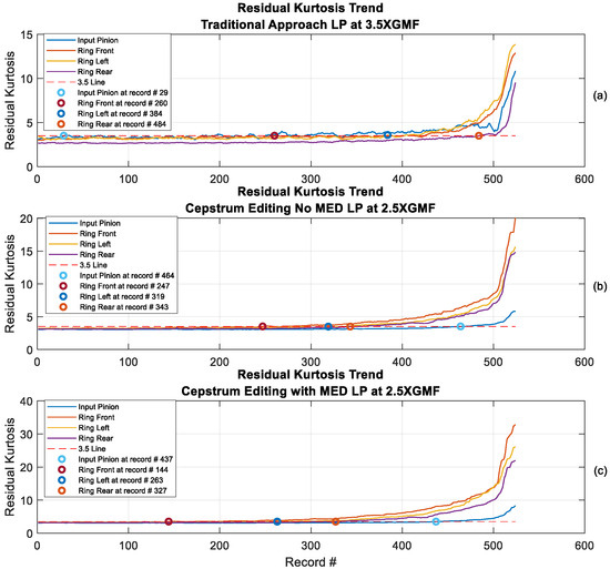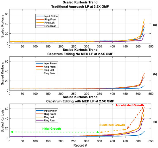 Scaled kurtosis trending: (a) Traditional approach with low-pass (LP) filter at 3.5× GMF (rolling median 9 samples), (b) Cepstrum editing with no MED (LP at 2.5 GMF: rolling median 12 samples), (c) Cepstrum editing with MED (LP at 2.5 GMF: rolling median 20 samples).