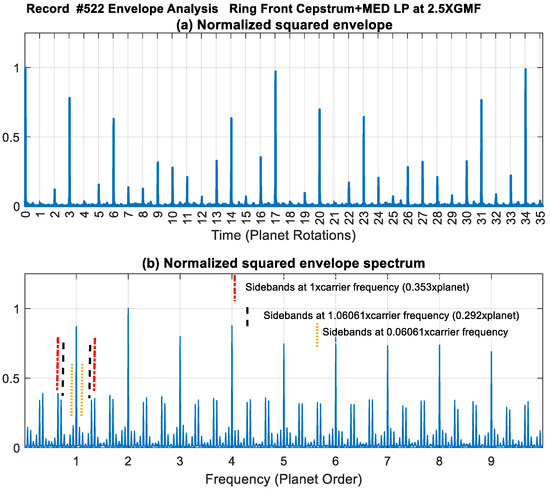 In order to gain more insight into the impact amplitude variation seen in Figure 17d and through cepstrum analysis, the squared envelope and its spectrum of the Ring Front sensor (signal presented in Figure 17d) were produced and are plotted in Figure 26. The squared envelope shows different amplitudes at each planet-ring mesh impact due to the variation of the impact locations with respect to the fixed sensor location. The spectrum shows the harmonics of 1× planet gear rotation with high amplitudes at 2× due to the presence of two impact events every planet rotation (planet-ring and plant-sun meshes). Modulation sidebands are seen at 1× carrier frequency (i.e., 0.3535× planet) and at 1.06061× carrier (i.e., 0.29293× planet) as well as at the difference frequency of 0.06061 (corresponds to 6 planet teeth difference).