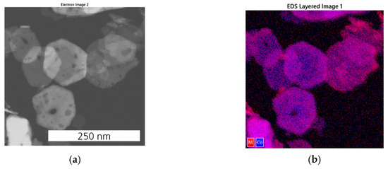 EDX elemental mapping of Ni0.5Co2.5O4 oxide indicates that the distribution of Co, O, and Ni is mainly uniform inside hexagonal plates (Figure 8). Thus, Ni is well integrated into the structure of Co3O4 oxide. Consequently, the application of a lower Ni:Co ratio results in a doped spinel structure, i.e., NixCo3−xO4, with highly uniform morphology and composition. However, for some particles, a slight inhomogeneous distribution of nickel in the hexagonal plates is still observed.