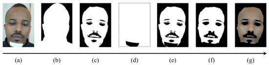Skin segmentation process: (a) facial ROI frame obtained using Viola–Jones detector [26]; (b) semantic segmentation using MobileNetV3 [28] implemented via MediaPipe; (c) skin segmented via k-means algorithm (k = 2); (d) chin stand mask binarized with a static threshold; (e) multiplication of (c,d); (f) the final binary mask after morphological opening; (g) an original frame multiplied by the binary mask (skin tissue frame).