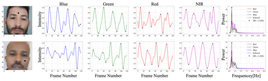 Pulsatile signal peaks and troughs. Left—black squares mark spatial locations at face images of two subjects in a 56 × 56 pixel resolution. Middle—the min-max normalized band-pass (0.75–3.5 Hz) filtered temporal signals of these locations for the B, G, R, and NIR channels, where detected peaks and troughs are marked with black dots. Right—their representation in the frequency domain, where the maximum-energy frequency is the locally estimated heart rate, marked with a black star.
