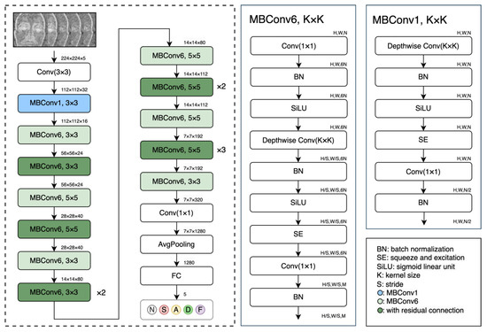 The EffecientNet-B0 general architecture (right), with the building blocks MBConv1 and MBConv6 (detailed at the left). The input is a 224 × 224 × 5 block that contains five pulsatile feature maps (for a four-second facial video), classified into five emotional states.