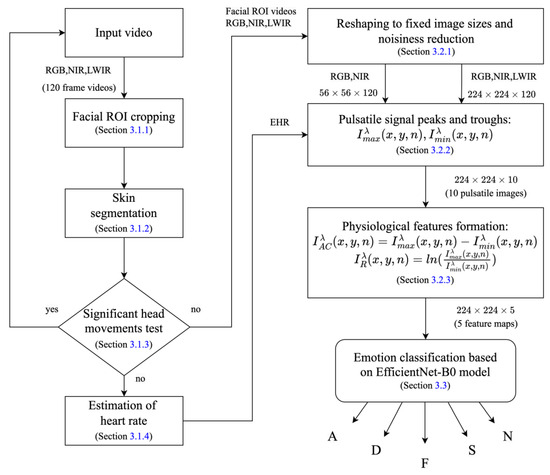A schematic diagram of the proposed method is presented in Figure 5. The inputs are the RGB, NIR, and LWIR video frames of the emotion-stimulated subjects’ faces.