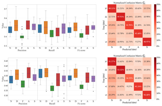 Furthermore, per-emotion class evaluations of the classification performances are depicted in Figure 7 (using the best input features, ), as a row-normalized confusion matrix (sum over all the 22 confusion matrices and then row-normalized) and alongside a boxplot measurement (precision, recall, and F1 score (per emotion class. According to this measurement, for the results indicate that the disgust (D) class was precisely identified 49.93% of the time, followed by the sexual arousal class (S) with 48.97%, the neutral (N) with 48.11%, the amusement (A) with 45.68%, and, lastly, fear (F) with 42.94%. In addition, for feature it was a little different, as the sexual arousal class changed place with neutral. It can also be seen that the fear class achieved the worst prediction precision in both features (42.94% for and for is 36.55%).