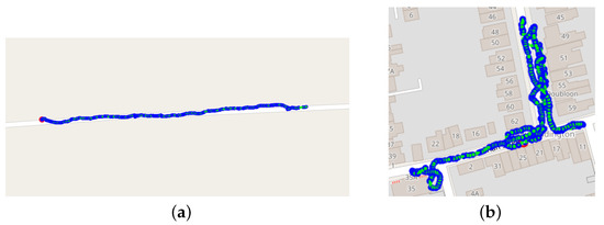 The collected data come from two different sets. The first one consists of 107 recordings collected by 10 volunteers recruited at the Oxford University Hospitals NHS Foundation Trust who were asked to perform 10 or more outdoor 6MWTs. Of these, 7 were cardiac patients under treatment at the clinic and 3 were healthy volunteers. Data were collected within a study with ethical approval from the UK National Health Service Health Research Authority (protocol reference numbers: 17/WM/0355) and informed consent was obtained from all participants involved. Each volunteer was asked to perform five conventional tests following the app instructions, and five “unconventional” tests, in which they would, on purpose, not follow the instructions, for example, by including several sharp turns. After each test, the participant noted if the test was made conventionally or unconventionally. In Figure 2, two examples of conventional and unconventional tests are shown.